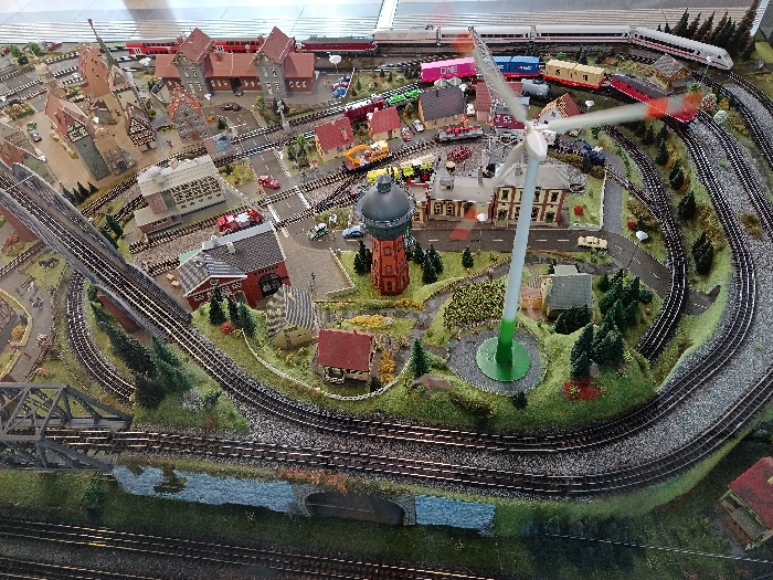 This image depicts an elaborate model train diorama situated in the city of Leipzig, Germany. The scene is a miniature landscape encompassing a town, countryside, and extensive railway infrastructure. **Environment:** The terrain features undulating green hills covered with artificial grass flocking, interspersed with clusters of miniature coniferous and deciduous trees. A simulated river or canal, painted in shades of blue and white, flows under a dark grey truss bridge and enters a tunnel. Grey paved roadways with white markings traverse the landscape, creating an intricate network for miniature vehicles. **Infrastructure:** Numerous railway tracks dominate the scene, forming multiple loops, sidings, and junctions. Tracks are present at ground level and on elevated sections, including a prominent bridge. The miniature town includes various buildings: several residential structures, some with red roofs and half-timbered detailing; a larger, multi-story grey/white building; and a significant red brick building with multiple arched bay doors. A tall, red brick water tower with a dark grey conical roof stands prominently within the town. A modern, white wind turbine with a green base is centrally located on a hill; its blades are blurred, indicating rotational motion. **Objects:** * **Trains:** Multiple model trains are visible. A white passenger train, resembling a German Intercity-Express (ICE) with several cars, is positioned on an elevated track section. Various freight trains, comprising different types of wagons including container cars (one marked "ONE" in pink) and brown/yellow boxcars, occupy other tracks and sidings. Red passenger cars are also present on some sidings. * **Vehicles:** Miniature road vehicles, such as red cars, a blue car, and a yellow truck with a boom or crane, are positioned on the roadways. **Actions/Interactions:** The blurred blades of the wind turbine indicate active rotation, suggesting power generation within the miniature environment. Trains are strategically placed on the tracks, some appearing to be in motion or staged for operation. The overall arrangement simulates a bustling, interconnected town and transportation hub. **People/Subjects:** Miniature human figures are present throughout the diorama, populating the streets and areas around buildings, though individual details are not clearly discernible due to the scale and photographic distance.
