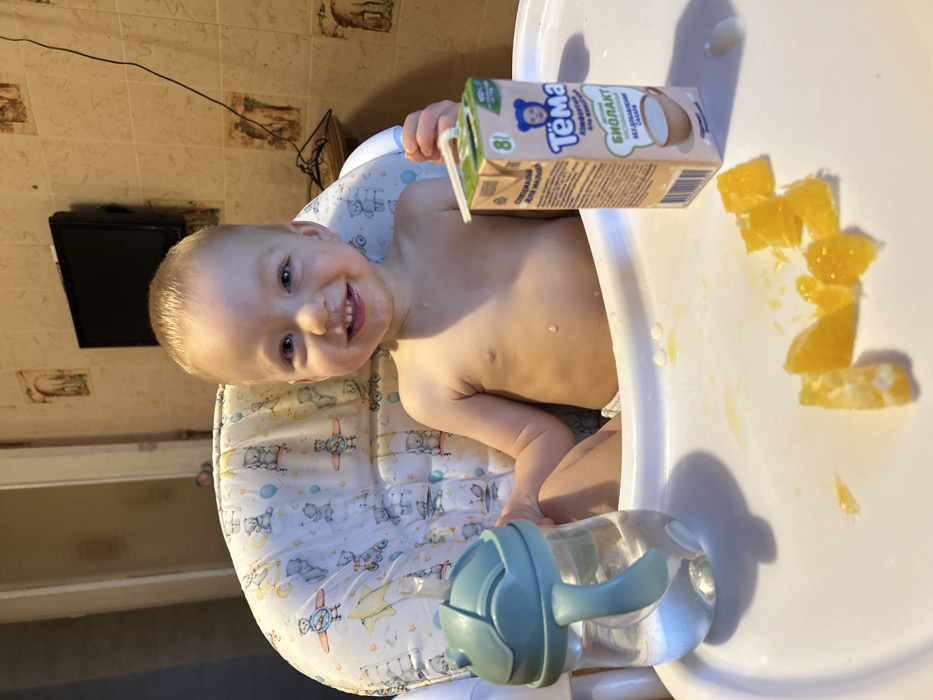 An overhead-view image depicts a blonde-haired, blue-eyed toddler, shirtless and wearing a diaper, seated in a white high chair with a fabric insert patterned with teddy bears and airplanes. The child is smiling, with a small amount of food residue on the face and chest. On the white high chair tray are a clear plastic sippy cup with a teal lid, containing water, and a small cardboard box of "Тёма Биолакт" (Tyoma Biolact) with a straw inserted. Scattered on the tray are several pieces of orange fruit and various food residues. The background reveals a kitchen area in Voskresensk, Russia, characterized by light-colored square wall tiles, a wall-mounted flat-screen television with a visible power cable, and a partially visible doorway to the left.