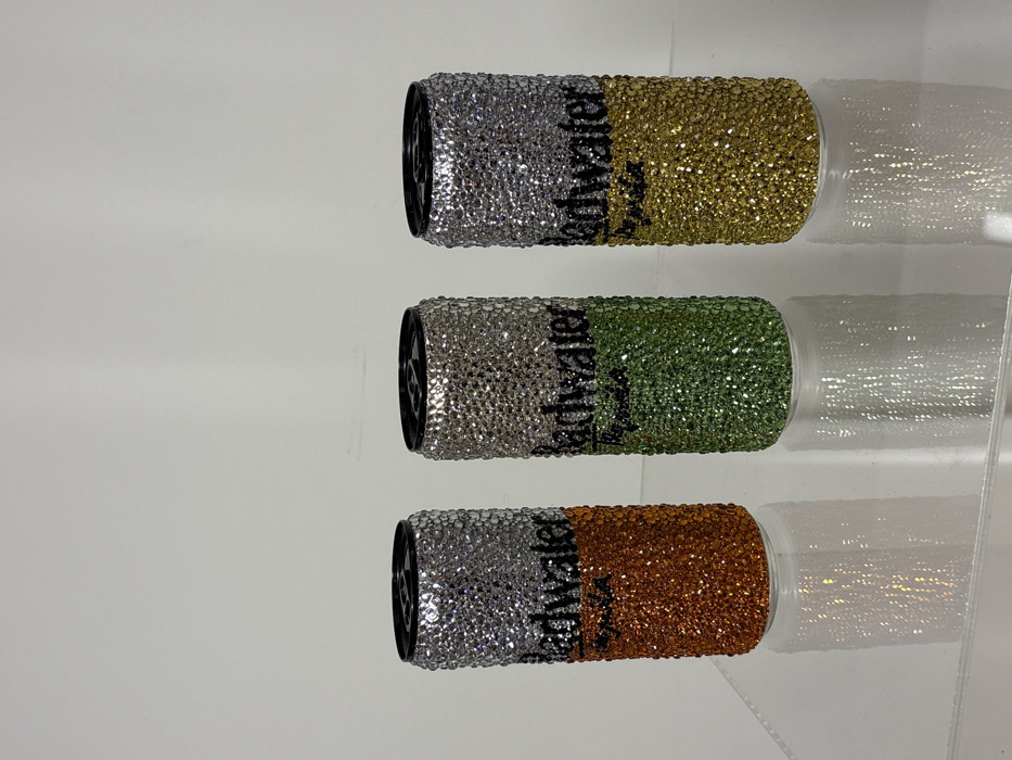 Three cans of "Recdwater" are displayed horizontally. Each can is half covered in silver crystals, transitioning to gold, green, and brown crystals respectively. The cans rest on a shiny, transparent surface, creating a blurred reflection. The background is a plain white wall. The color variations of the crystals distinguish each can.