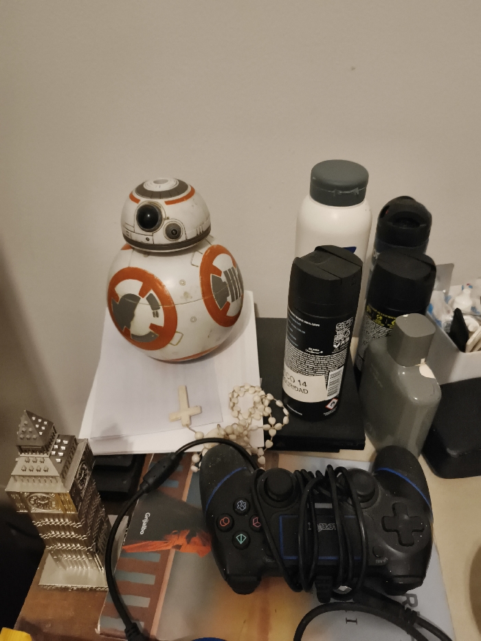 A table holds a BB-8 droid figure, various spray bottles (white, black, grey), and a silver Big Ben model. A crucifix and rosary beads lie on white paper. A tangled, black Playstation controller is placed atop a book.