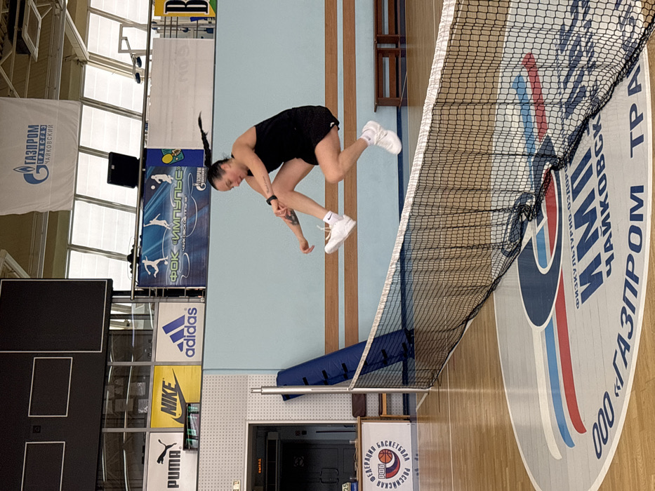 An indoor sports hall in the "Impulse" Physical Culture and Wellness Complex in Chaikovsky, Russia, is depicted. The scene features a single adult female captured mid-air, jumping over a black sports net positioned across a polished wooden court. She wears a black sleeveless top, black shorts, and white athletic shoes; a dark watch is on her left wrist, and tattoos are visible on her left arm. Her dark hair is braided and pulled back, and her body is oriented diagonally to the left, with knees bent and arms partially raised. The wooden court features painted lines and a prominent circular logo displaying "ФИЗКУЛЬТУРНО-ОЗДОРОВИТЕЛЬНЫЙ ИМПУЛЬС" (Physical Culture and Wellness Impulse) and "ООО "ГАЗПРОМ" ЧАЙКОВСКИЙ ТРАНСГАЗ." The background walls are light blue with a darker stripe. Above, multiple banners and logos are visible: a white "ГАЗПРОМ ЧАЙКОВСКИЙ" banner, a blue banner for "ФОК «ИМПУЛЬС» ЧАЙКОВСКИЙ Г. МГ," and mounted logos for Puma, Nike, and Adidas. A scoreboard with two dark rectangular displays is present on the upper left wall. To the left, a blue padded vertical support stands near a table displaying a "РОССИЙСКАЯ ФЕДЕРАЦИЯ БАСКЕТБОЛА" (Russian Basketball Federation) logo. Wooden benches are visible along the far wall.