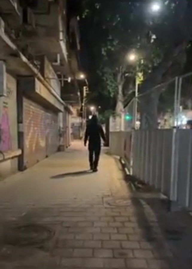 At night, a solitary figure is seen walking down a narrow alleyway, away from the camera's perspective. The individual is dressed in dark clothing, making them appear as a silhouette against the dimly lit environment. The alleyway is paved with cobblestones and bordered by buildings on one side with closed storefronts covered in graffiti. On the other side is a temporary construction fence, adding to the urban feel. Streetlights illuminate the scene, casting long shadows, and a tree with dense foliage is also visible. Cars can be heard in the background.