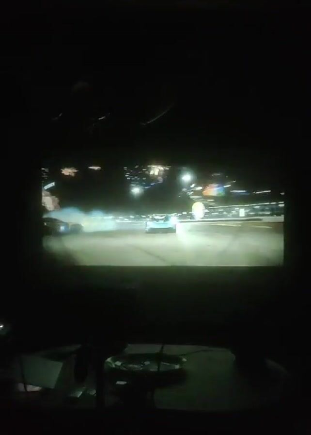 screen playing a racing scene, followed by a close-up of a man's face, and then a shot of a group of people. The environment is dark. There are objects on a table in the foreground.