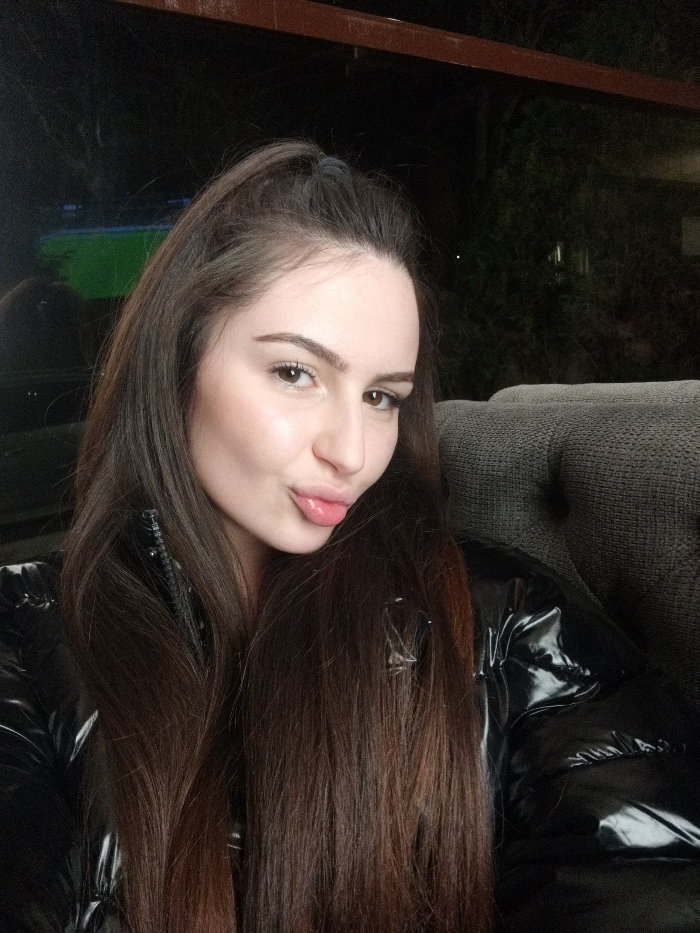 A young adult female is depicted in a close-up, chest-up photograph, positioned indoors. She has long, dark brown hair, with the upper section gathered and secured by a dark hair tie, while the remainder falls over her shoulders. Her complexion is fair, and her eyes are light brown. She is wearing a black, shiny puffer jacket. Her lips are pursed in a "kissing" pose, accompanied by a slight smile. She is seated on a dark gray or black upholstered armchair or sofa, featuring visible button tufting on the backrest. The background is predominantly dark, indicating an evening or nighttime setting. A faint green rectangular light source or reflection is visible in the upper left background, along with a dark horizontal beam structure across the top. The scene is located in the city of Targovishte, Bulgaria.
