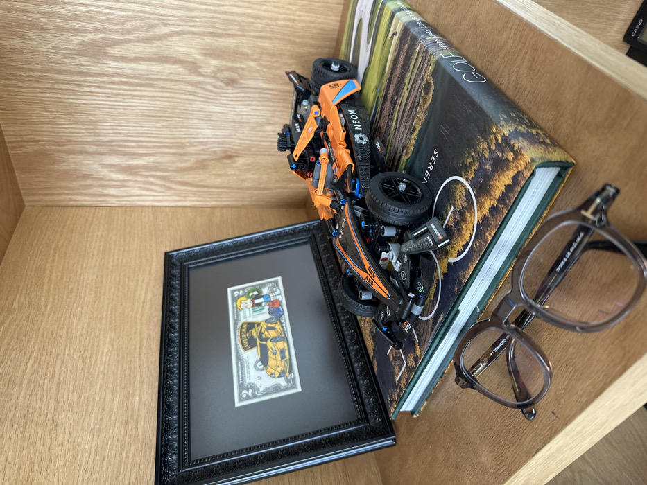 In an oak shelf, a framed two-dollar bill with cartoon figures rests next to a book titled "GOLF SEVEN-HEAD COMOE MARIBAE." Atop the book is an orange and black LEGO race car. A pair of gray-tinted glasses with visible "TOM FORD" branding sits beside the book, angled towards the right side of the frame. The composition is angled, creating a diagonal line from the lower left to the upper right of the image.