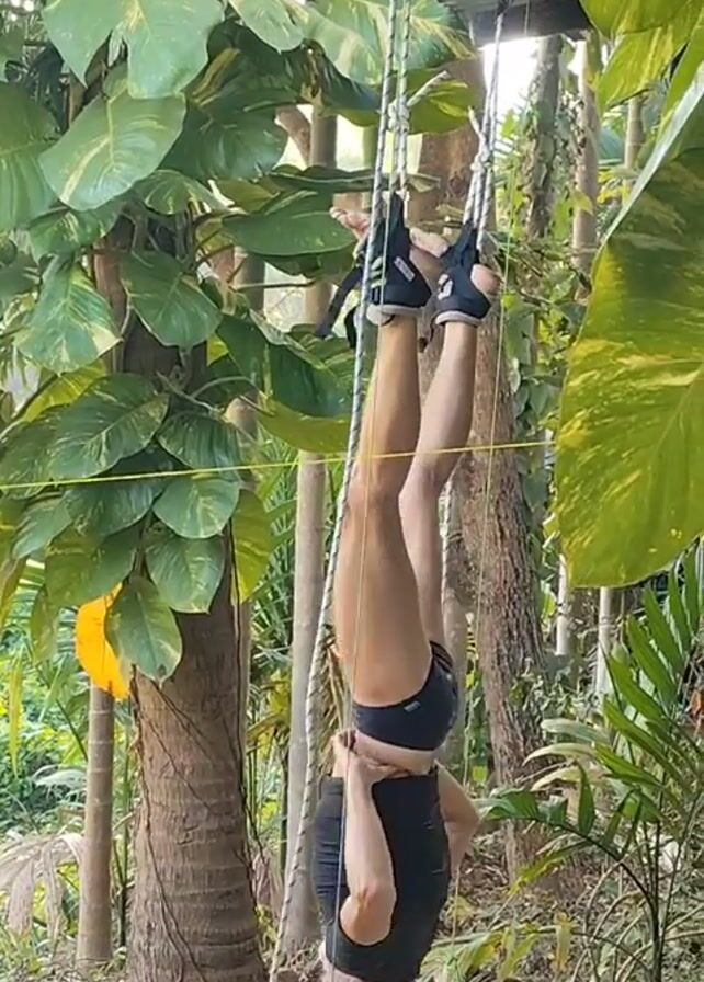 A man is hanging upside down by his ankles. His ankles are strapped to black pads which are attached to thick white ropes. The ropes run up to a structure with a roof which is above him. He is wearing black shorts and a black shirt. He has short grey hair. He is outside in a lush, green, tropical environment with palm trees and large-leafed plants around him. The ground below is partially covered with a colorful blanket.