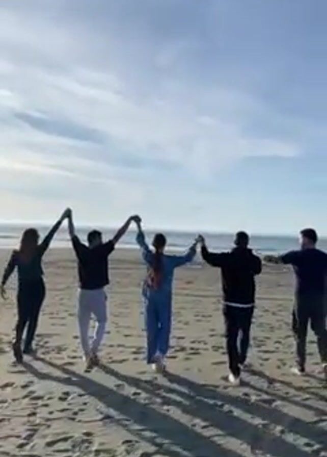 five people on a sandy beach, holding hands in a line and facing away from the camera towards the ocean. They initially have their arms raised, then lower them to shoulder height. The sky is blue with scattered clouds, and the ocean stretches to the horizon. Footprints are visible in the sand. The people are dressed in casual clothing.
