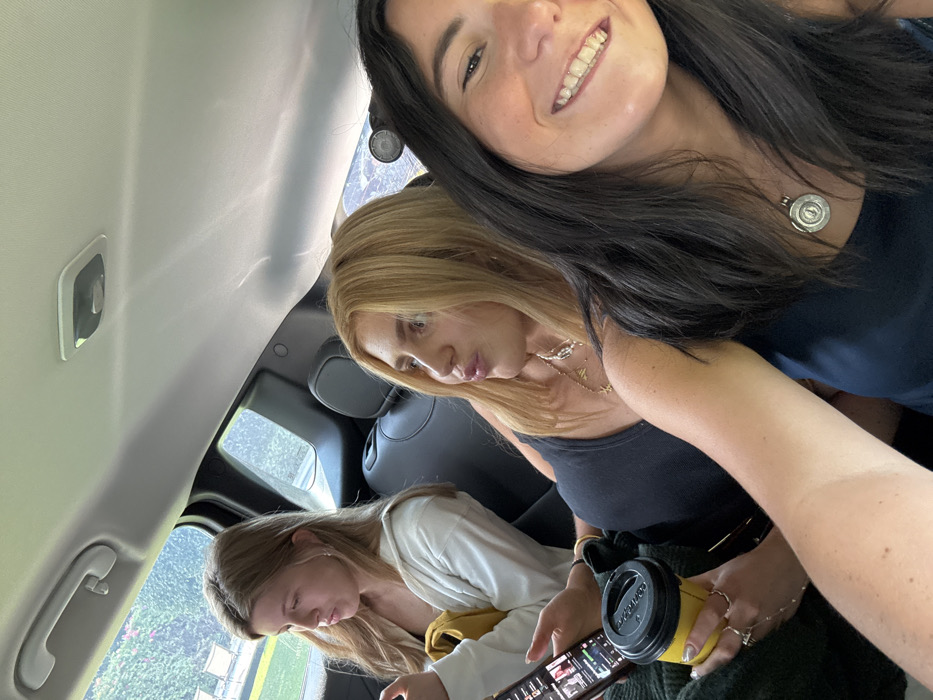 Three women are in a car. One woman with dark hair smiles at the camera, wearing a silver pendant necklace. Behind her, a blonde woman looks down. The third woman, also blonde, is in the front seat and looks at her phone. She holds a yellow cup with a black lid. The car interior is visible.