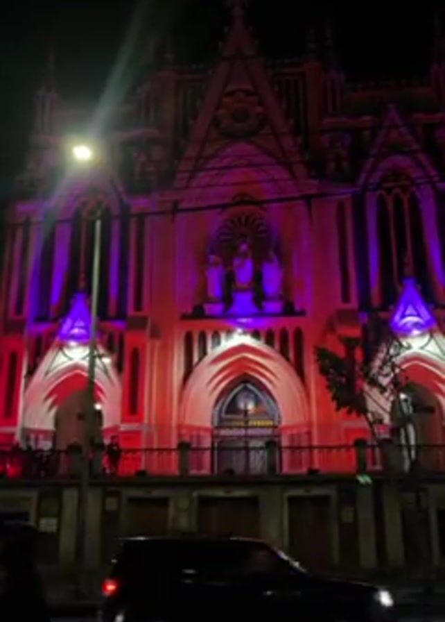 church illuminated with purple and red lights at night. The church's facade is intricately detailed, with pointed arches, statues, and a prominent cross on top. There is a street in front of the church, and traffic, including cars and a motorcycle, passes by. A street light illuminates the area. A person walks across the lower-left portion of the frame, obscured by the darkness.