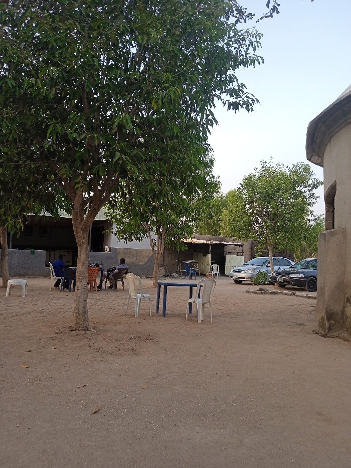 An outdoor scene shows a sandy ground area with trees offering shade. A blue table with white chairs sits in the center. People are seated at tables under the trees. A silver and black car are parked nearby. In the background, there's a building and a small shack-like structure. To the right, a portion of a weathered, dome-shaped building is visible. The sky is a pale blue.