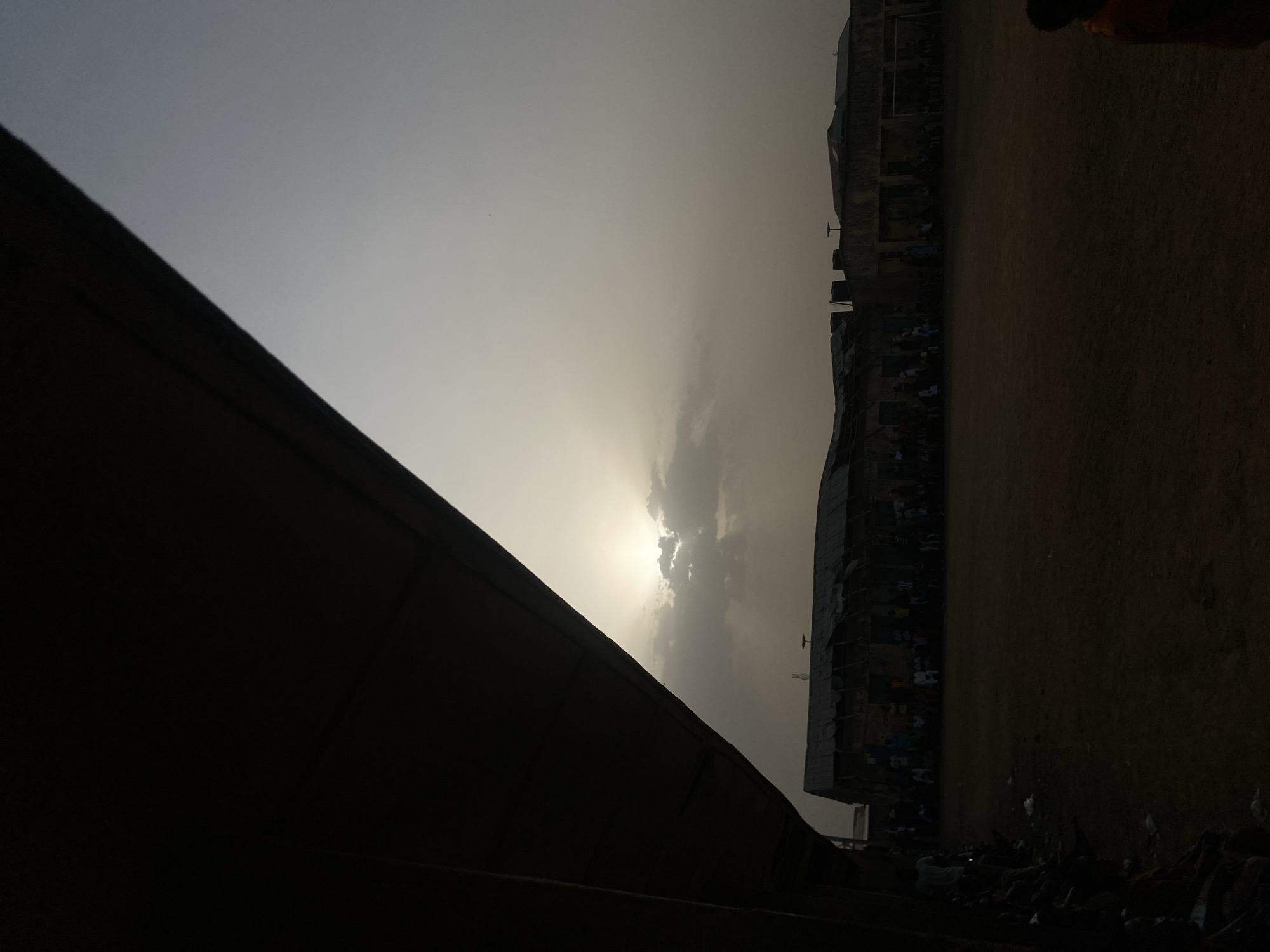 The image, taken in Barden Yana, Nigeria, shows a landscape dominated by a light gray sky with the sun partially obscured by clouds. In the foreground, a dark, sloping surface, possibly a roof or wall, occupies the left side. To the right of the sky, a building or structure is visible, with a crowd of people congregated along its base. The ground is a dirt field. The overall atmosphere is dim, possibly due to the time of day or weather conditions.