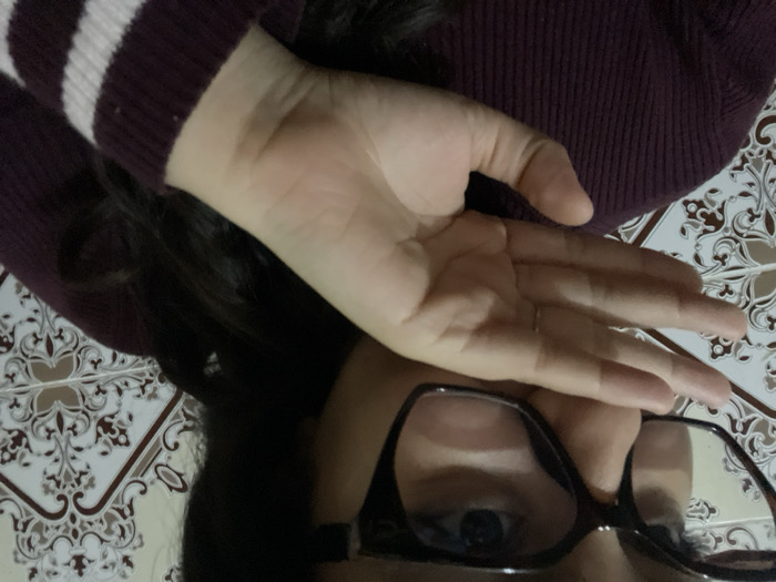A person wearing glasses obscures part of their face with a hand. The person has dark hair and wears a striped burgundy sweater. The background shows patterned floor tiles. The image is oriented in a way that the floor appears as a backdrop. One eye is visible through the glasses.
