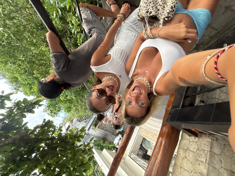 The image depicts an outdoor scene in Uluwatu, Indonesia, showcasing three individuals on a pathway with railings amidst lush tropical vegetation and architectural elements. In the immediate foreground, a light-skinned female with blonde hair and green eyes is holding a camera, taking a selfie. She wears a white tank top, a shell-beaded necklace with small square charms, numerous bracelets on her right wrist (including one with a leopard print pattern), and a pink, black, and white braided bracelet on her left wrist. She displays an open-mouthed, excited expression. Light blue, possibly sequined, bottoms are visible below her top, and a leopard-print bag is partially seen on her right side. Behind her, a second light-skinned female with dark hair pulled back and wearing large dark sunglasses is positioned. She wears a white mesh or crochet sleeveless dress, a shell-beaded necklace, multiple bracelets on her left wrist, and an arm cuff on her right bicep. Her mouth is open in an excited expression, and she is also looking directly at the camera. Further in the background, a male individual with dark hair tied in a ponytail wears a black baseball cap, a dark grey t-shirt, and grey shorts. He is facing away from the camera, gripping a black metal railing with both hands, and appears to be moving along a path or stairs. A dark flip-flop is visible on his left foot. The environment includes two prominent diagonal wooden handrails in the mid-ground. Behind these, a black metal railing is visible. The left background features architectural elements: a stacked stone wall, white concrete walls, and windows of a multi-story building. Dense green foliage and tree branches dominate the upper and right portions of the image. Several blurry figures are faintly visible in the distant left background, suggesting other people on the pathway. The overall setting is an outdoor, possibly resort or public access area, characterized by its tropical vegetation and constructed pathways.