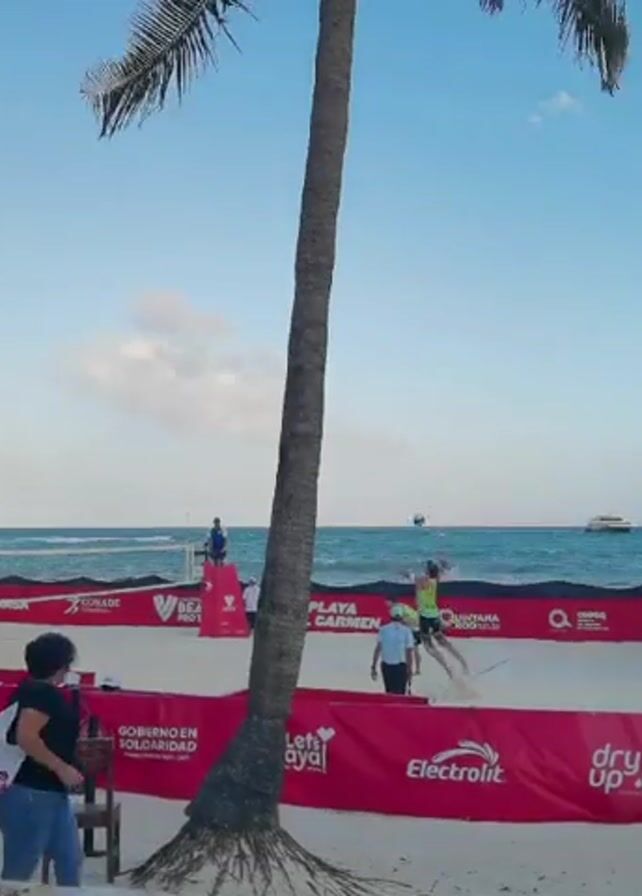 Here's a matter-of-fact description of the scene: The scene takes place at a beach volleyball event on a sunny day with scattered clouds and a clear blue sky. In the center of the frame stands a palm tree. The beach volleyball court is surrounded by a red barrier with sponsor logos, including "Electrofit" and "dry up". Two teams, identified by their colored jerseys, are actively playing. Spectators are seated in the stands to the right. A white building with a tiered structure is behind the spectators and has additional people on the balconies. The ocean is visible in the background, with a boat in the distance. To the left of the court, there is a large scoreboard and a shaded seating area. People are standing and walking around the periphery of the volleyball court. There is crowd noise in the audio.