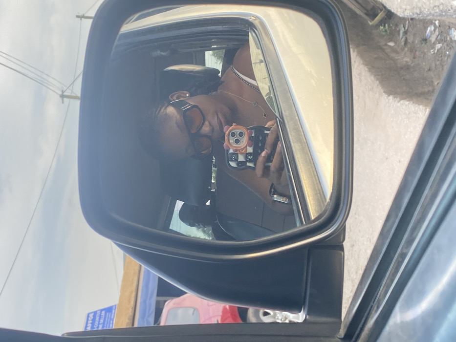 The reflection in a car's side mirror shows a person wearing dark-framed sunglasses and a necklace