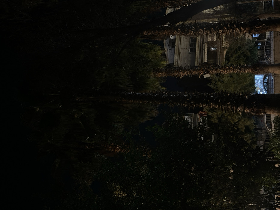 The image depicts an urban outdoor scene at night within Sarouja Municipality, Syria. The foreground and midground are dominated by multiple tall palm trees featuring textured trunks and dark fronds, interspersed with other dense, dark green foliage. In the background, a multi-story, light-colored building with multiple windows is partially visible, some windows showing faint internal illumination. Below the building, a street or paved area is present, occupied by several indistinctly visible cars. Artificial light sources illuminate portions of the background building and the street, with a prominent blue light visible behind foliage on the right side of the street. A small, white, rectangular object is attached to the trunk of one central palm tree. No human figures are discernible within the frame.