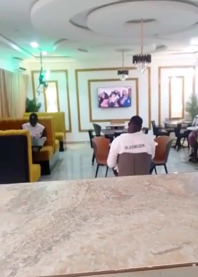 The interior of what appears to be a dining area or restaurant is captured from behind a counter with a faux marble top. The space is brightly lit with recessed and decorative hanging light fixtures. Several individuals are seated at tables and in booths. One person is wearing a white shirt with the word "BLASMUSIK" printed on the back. A TV screen is mounted on the wall, displaying a group of people. A brief interaction takes place among people standing near one of the tables. The decor features gold-framed accents on the walls.