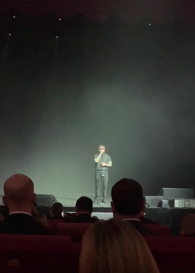 A man is performing on a stage. He is wearing dark clothing, sunglasses, and a microphone, and stands in the center of the stage. Red and white lights shine from above. The stage is surrounded by a dark curtain. An audience is seated in the foreground, mostly facing the stage. The audience is not visible clearly from the shoulders up. The scene is indoors and likely a theater or auditorium.