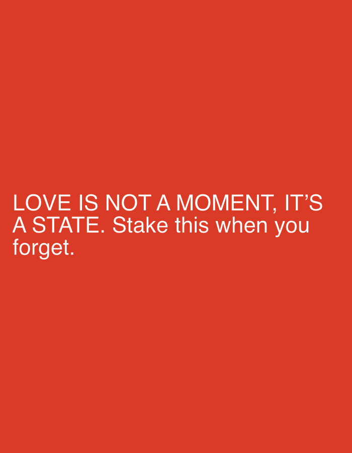 The image displays white sans-serif text against a solid orange-red background. The text is positioned in the lower-left quadrant and reads: "LOVE IS NOT A MOMENT, IT'S A STATE. Stake this when you forget." No individuals, specific objects, or environmental features are depicted. The scene is static, comprising only text on a colored field. No visual cues within the image allow for the identification of a specific location in Tbilisi, Georgia, or any other geographical area.
