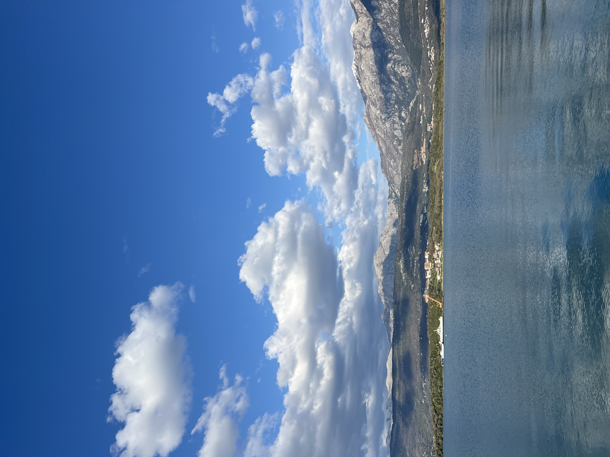 The image captures a panoramic view of the coastal area in Đuraševići, Montenegro. The lower third features a calm, deep blue body of water, exhibiting subtle ripples and faint reflections. A narrow strip of land forms the midground shoreline, characterized by green vegetation and a scattered settlement of light-colored buildings with terracotta roofs. A white vessel is moored near the left-center of the shoreline, positioned next to an orange gantry crane. Two small, dark objects are present on the water's surface in the midground. The background is dominated by rugged mountains, displaying rocky formations and patches of snow or light-colored rock on their peaks. Shadows are cast across parts of the mountain range. The upper two-thirds of the image show a vibrant blue sky filled with numerous white and grey cumulus clouds. No people are visible within the frame.