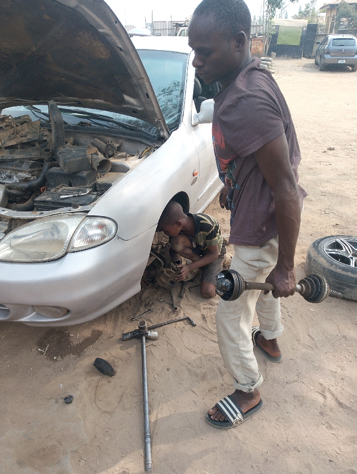 This image depicts an outdoor automobile repair scene in Kagini, Nigeria