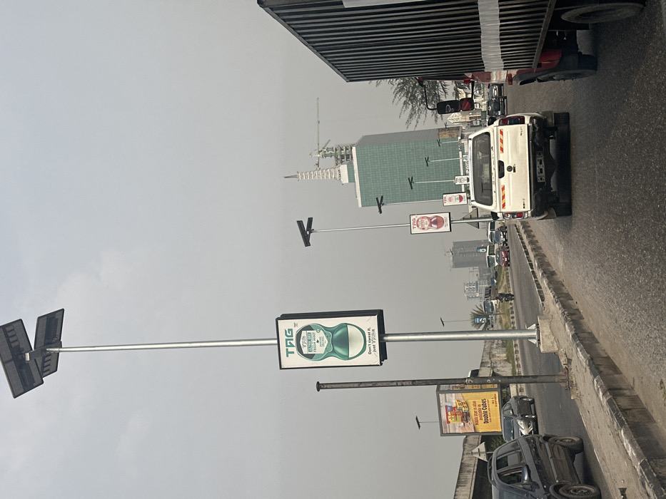 A street scene shows billboards advertising TAG deodorant and other products. Traffic is visible with a white truck and several cars. A modern building under construction stands in the background. The sky is overcast and grey, giving the scene a hazy appearance. Street lights are present, featuring solar panels.