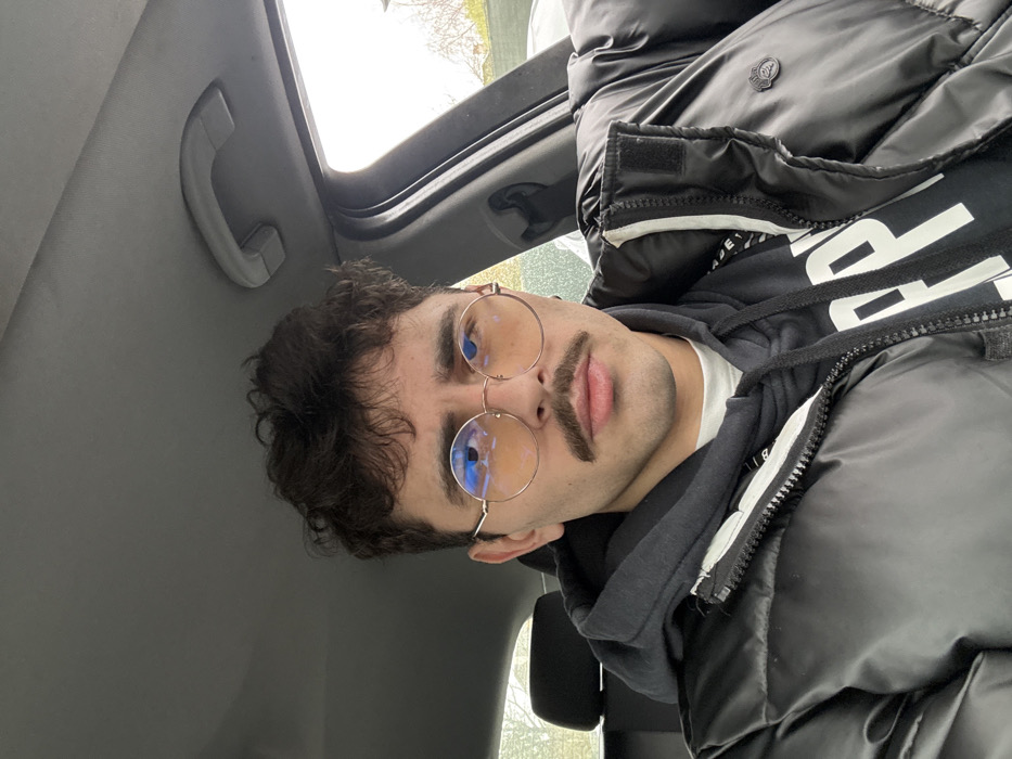 In Chantepie, France, a male individual is depicted seated in the front passenger seat of a vehicle. The subject is a young adult with dark, curly hair and a prominent dark mustache. He wears round, gold-rimmed eyeglasses with light orange-tinted lenses exhibiting blue reflections. His attire consists of a white base layer, a dark hooded sweatshirt with partial white lettering, and a black puffer jacket, which features a front zipper and a dark, circular emblem on the left chest. The vehicle's interior includes a gray headliner and a passenger grab handle above the door frame. Outside the passenger window, a blurred background reveals green foliage under diffuse, overcast lighting conditions. The individual faces directly towards the camera.