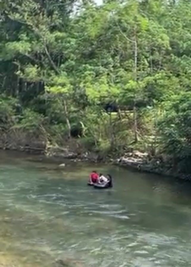 scenic view of a river bordered by lush green trees. In the middle of the river, two individuals are seen floating on a black inflatable tube. The river water appears clear and flows gently, reflecting the surrounding greenery. Above the riverbank, amid the trees, a black vehicle is visible.