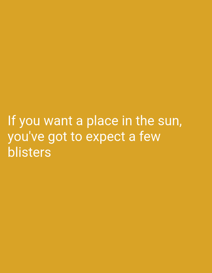 The image displays a solid mustard yellow background. White, sans-serif text is centrally aligned within the lower half of the frame. The text reads: "If you want a place in the sun, you've got to expect a few blisters". No people, identifiable objects, actions, or environmental features of Jurong Pante, Indonesia, or any other location, are depicted.
