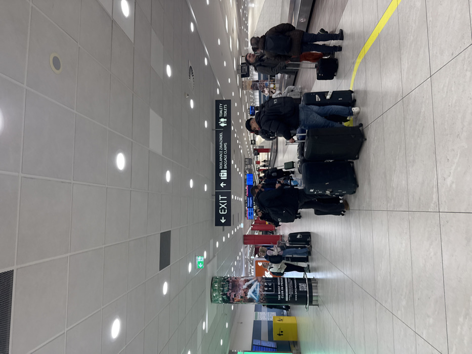 This image depicts an airport concourse. Travelers with luggage are queuing in a line. Signs indicate "EXIT" and "BAGGAGE CLAIMS" with arrows, as well as "TOILETS" with accompanying icons. A column displays advertising and a small monitor is visible near a yellow bin. The ceiling is comprised of rows of recessed lights. A yellow line is painted on the floor. The image appears to be rotated sideways.