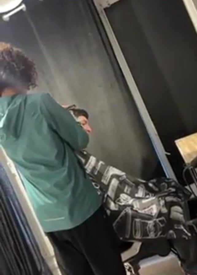 A barber in a green jacket and black pants is giving a haircut to a man sitting in a barber's chair