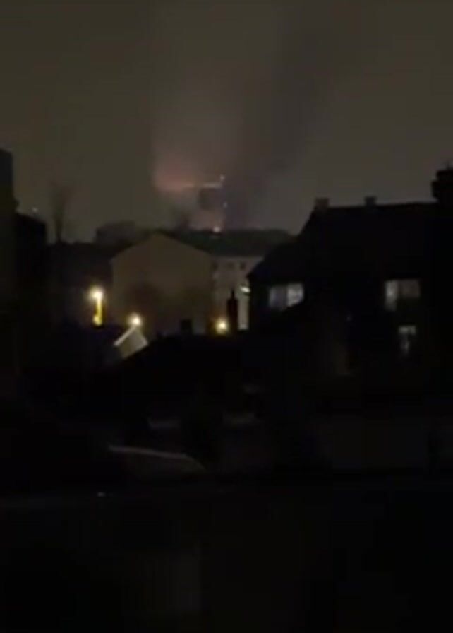 At night, smoke billows upwards above buildings, lit up with red and orange light within the smoke cloud