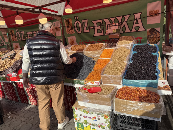 - "The image depicts an outdoor market stall in the city of Şişli, Turkey, offering various dried fruits and nuts" by FM-E68DV2, licensed under CC BY 4.0