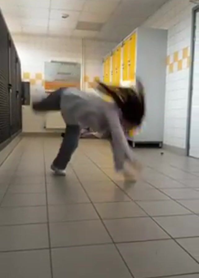 A young woman attempts a handstand in what appears to be a locker room with yellow and grey lockers. She loses her balance, falls to the floor and slides on her bottom to the end of the hallway. Another person is sitting in the background, watching.