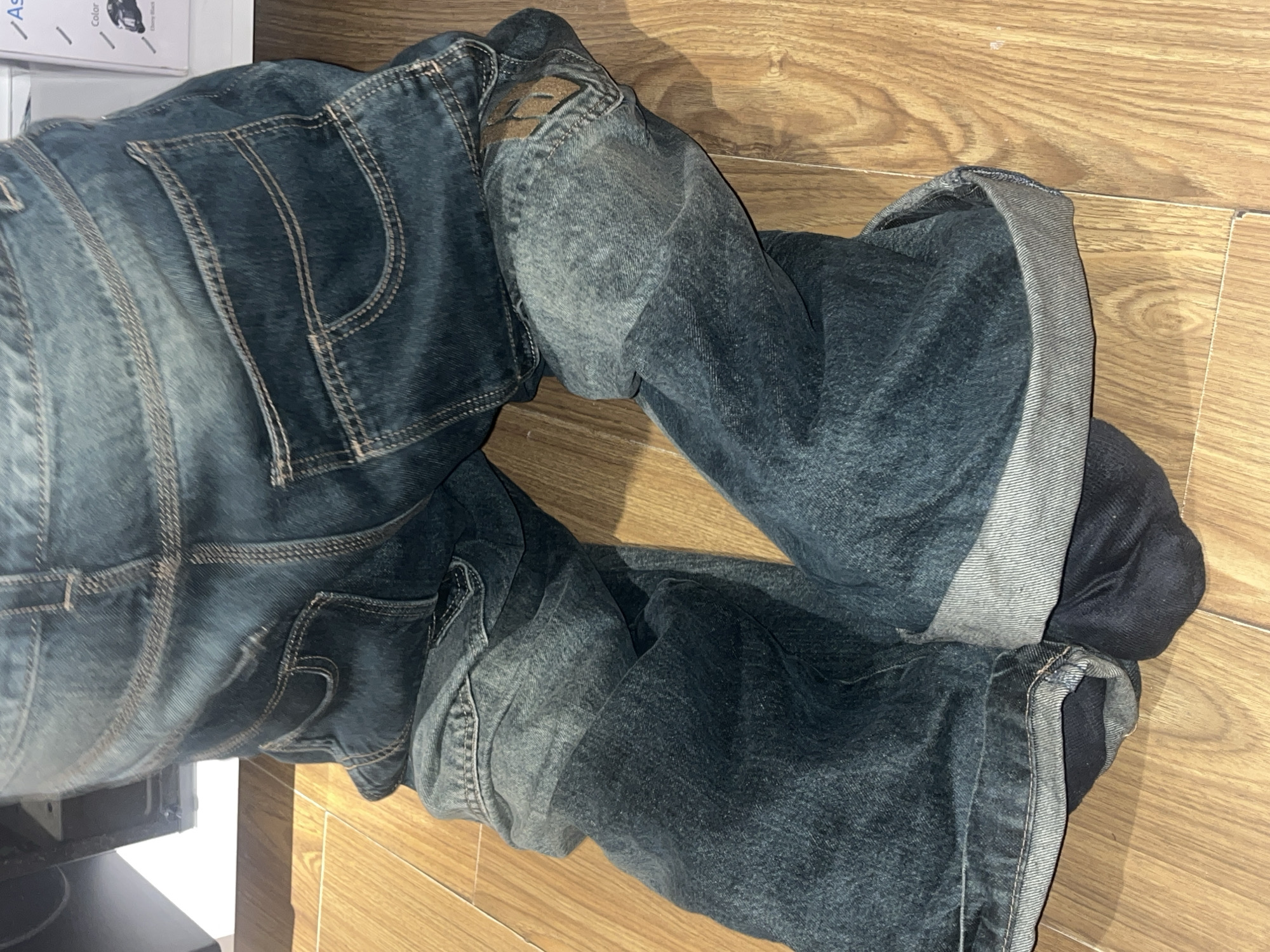 pair of dark blue jeans lying on a light brown wood-grain floor. The jeans are folded or twisted, revealing cuffed hems. A portion of a white box is visible in the upper left corner of the image. There is no indication of the location being Buenos Aires, Argentina, or any other specific location. There are no people visible in the image.