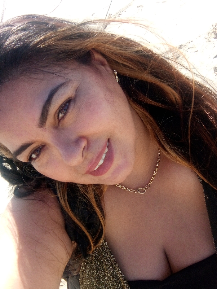 A high-angle, close-up selfie captures a woman smiling and looking directly into the camera lens. The scene is outdoors under bright, natural light, likely in Juan Griego, Venezuela, with a blurred, light-colored background resembling sand or light-toned ground. The woman has medium-toned skin, dark eyebrows, and brown eyes. Her lips are slightly parted in a smile, revealing white teeth. Her long, wavy hair, featuring light brown and auburn highlights, flows around her face. She wears a dark-colored top, possibly strapless, which reveals her décolletage, and a shimmering gold-toned fabric is visible over her left shoulder area. Her visible accessories include a delicate gold-colored chain earring on her right earlobe and a gold-colored chain necklace with an interlocking link detail positioned around her neck.