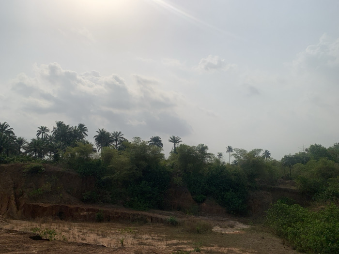 The image depicts an outdoor, natural landscape located in Ikot Obio Ata, Nigeria, under an overcast sky with a visible, diffuse sun in the upper left