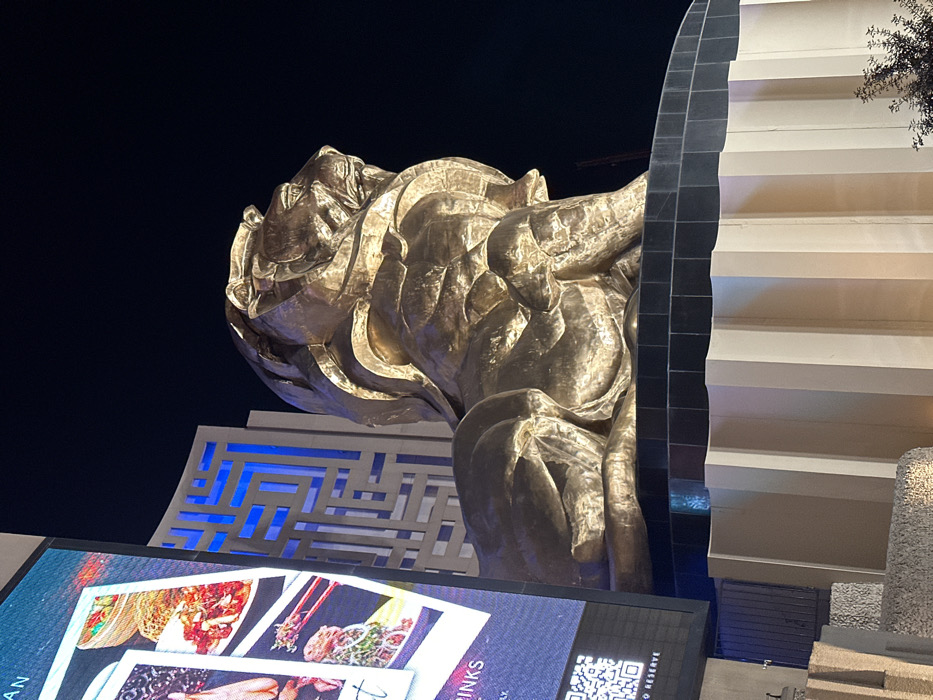 A golden lion statue looms against a dark blue sky, positioned in front of a building with a blue geometric pattern. A digital billboard advertising food partially obscures the base of the statue. A black decorative structure and a modern building with white horizontal lines sit to the right of the statue. The image is taken from a low angle, emphasizing the statue's size.