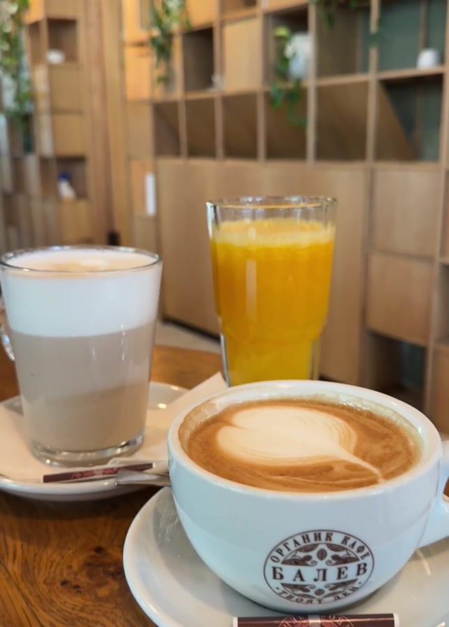 table in a cafe. On the table are three drinks: a latte in a glass, a glass of orange juice, and a cappuccino in a white cup. The cappuccino has latte art in the shape of a heart. The cup has the words "ORGANIC CAFE BALEV" on it. There is a brown sugar packet on the saucer underneath the cappuccino cup. The table is made of wood. In the background is a wooden shelving unit with plants.