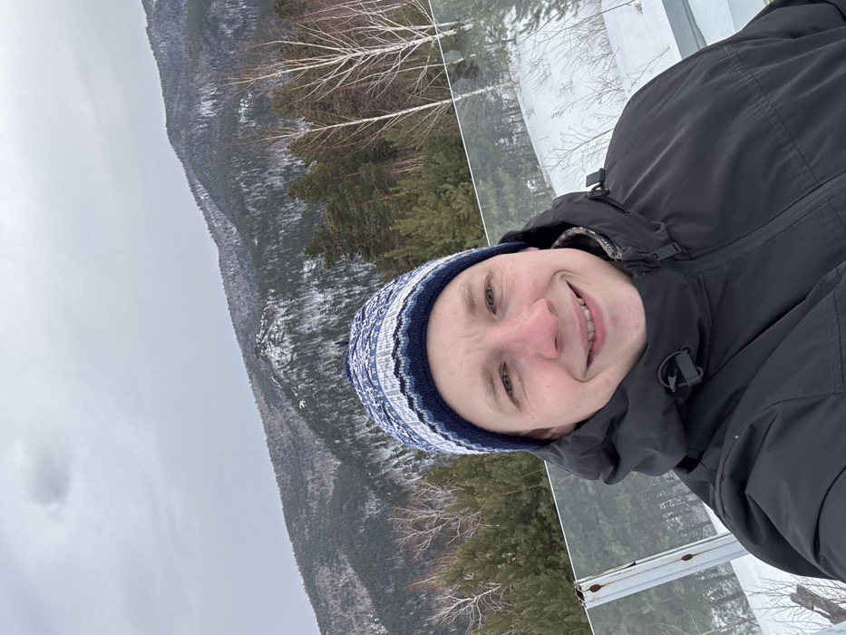 A male individual is shown from the chest up in a selfie-style photograph, smiling directly at the camera. He has light skin and a short hairstyle, partially covered by a multi-patterned knit beanie in shades of dark blue, light blue, white, and grey. He wears a dark, possibly black or charcoal grey, puffer jacket with a visible zipper down the front and a textured collar underneath. Behind the individual, a transparent glass barrier with a vertical metal support on the left separates the foreground from a snow-covered landscape. Beyond this barrier, the terrain slopes downwards, featuring bare deciduous trees with thin branches and numerous evergreen coniferous trees, some dusted with snow. In the background, multiple densely forested mountains rise, with patches of snow visible on their slopes, particularly on the higher peaks. The sky above is overcast and uniformly grey. The scene is set outdoors in a mountainous, snow-covered environment, consistent with a viewpoint overlooking the rugged terrain of the Stolby Nature Reserve, located within or immediately adjacent to the city of Krasnoyarsk, Russia, during winter or early spring conditions.