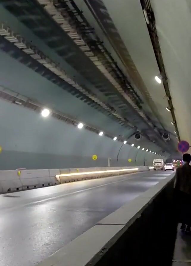 A person wearing a brown coat walks along a sidewalk inside a brightly lit tunnel. The tunnel's interior walls are light blue and white. Cars drive through the tunnel. The sidewalk is elevated above the road with a concrete barrier in between. There is trash on the sidewalk. Lighting fixtures are attached to the ceiling of the tunnel. Signs are posted on the tunnel walls.