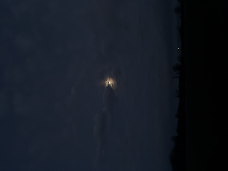 A blurry image reveals a small, bright moon centered in a dark, clouded sky. The lower half of the frame contains blurred cloud formations, while the right edge is a dense, nearly black mass, possibly trees or land against the night. Faint, distant lights are barely visible along the horizon.