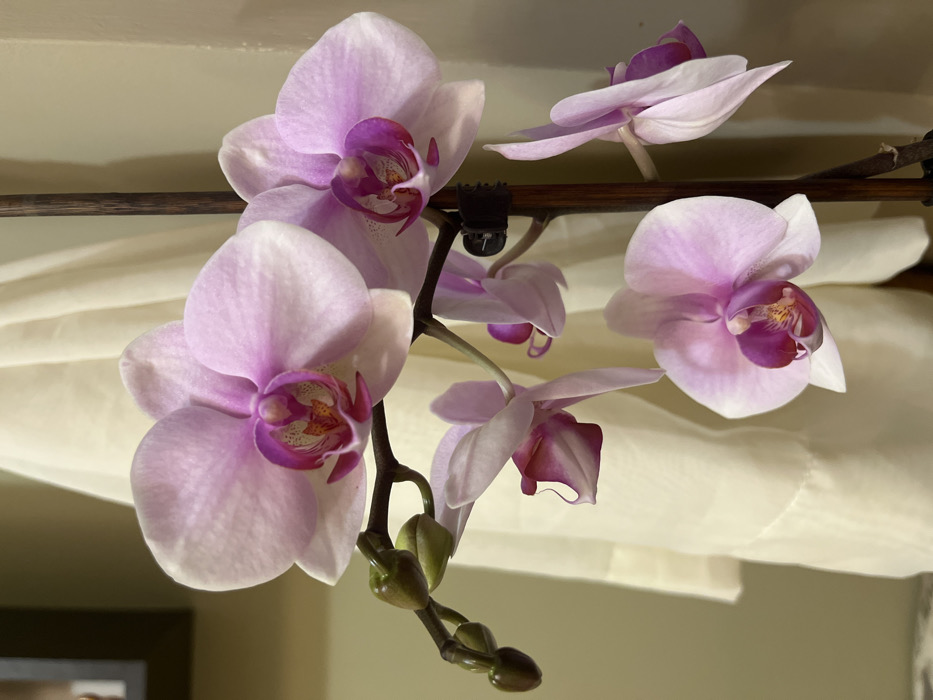 The image displays a close-up, indoor scene primarily featuring a blooming Phalaenopsis orchid. The plant exhibits multiple open flowers with pale pink to light lavender petals, characterized by prominent fuchsia or magenta centers and yellow accents on the labellum. Approximately seven to eight open blooms are visible, distributed along a dark brown stem, which is secured by a dark clip to a visible support stake. On the left side of the main flower stalk, several green, unopened flower buds are present, indicating ongoing growth. The background consists of a light, possibly cream-colored, vertical fabric, consistent with a curtain or drape, exhibiting soft folds. To the upper left, a partial dark rectangular frame is visible against a muted olive-green or beige wall. The right side of the background shows a plain, light beige wall surface. No people are present, and no specific actions or interactions are depicted. The environment is interior, under soft, ambient lighting conditions. The image contains no discernible visual information to determine its geographical location, including the city of Varna, Bulgaria.