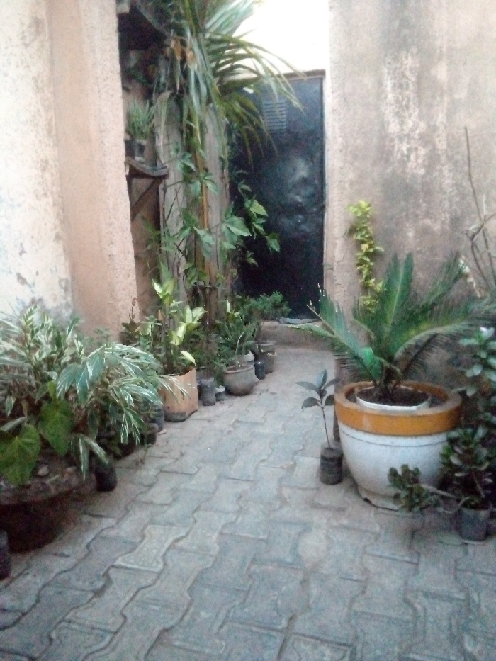 The image displays a narrow outdoor pathway in Bukuru, Nigeria, flanked by walls and dense vegetation. The ground is paved with interlocking grey concrete blocks. On the left, a light beige wall borders a cluster of potted plants, including several with variegated green and white leaves, and a taller plant with palm-like fronds. These plants are housed in various containers, some appearing to be repurposed. On the right, a light grey wall, exhibiting some discoloration, parallels the path. A large white ceramic pot with a yellow rim, containing a cycad-like palm, is prominent on this side, surrounded by smaller potted plants. A dark, recessed doorway or opening is visible at the end of the pathway, partially obscured by greenery. No individuals or specific actions are depicted within the scene.