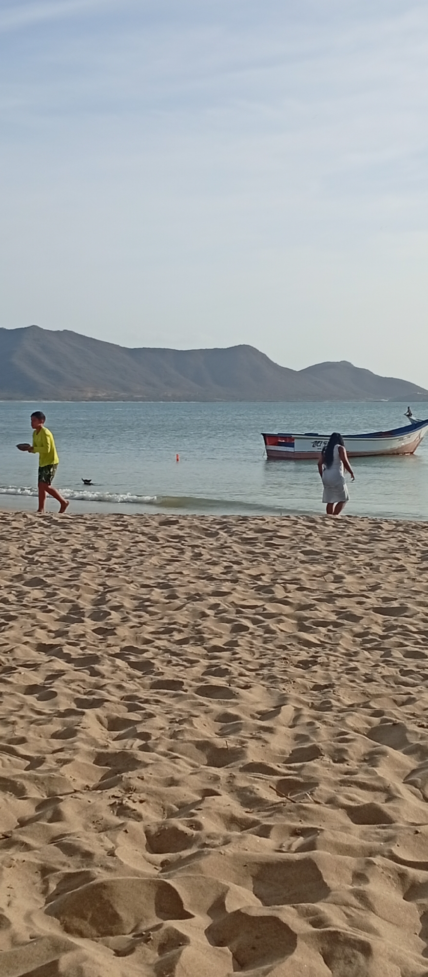 The image depicts a coastal scene at Playa La Galera in Juan Griego, Venezuela. A boy in a yellow shirt and patterned shorts walks along the shoreline, carrying a bowl-like object. A woman in a white dress is wading in the water near a small boat. The water is calm, with a buoy visible. A dog is swimming in the water. In the background, hills and mountains are visible under a bright sky. The foreground shows a large expanse of sandy beach.