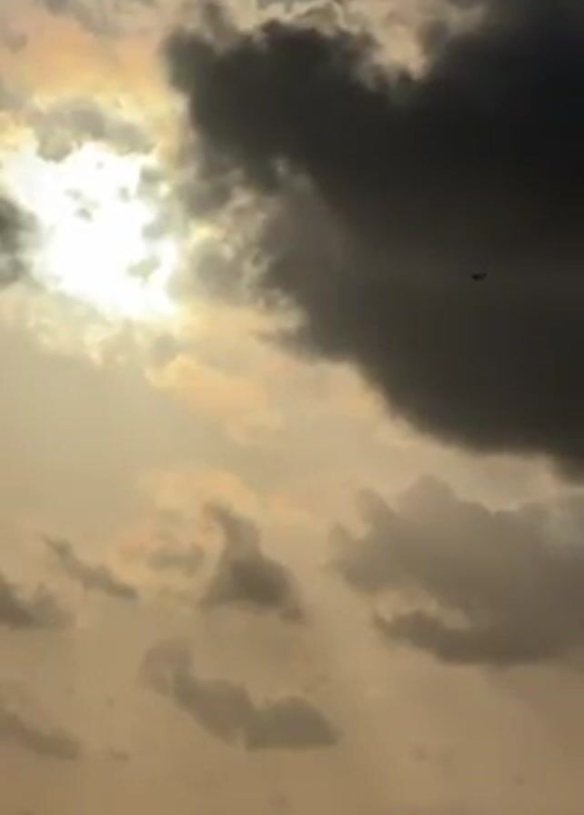 The sky is filled with various shades of clouds, ranging from lighter, translucent formations to a large, dark cloud covering much of the right side of the frame. The sun shines brightly through a gap in the clouds on the left, creating a diffused glow. A small object resembling a distant airplane is visible silhouetted against the brighter sky. The overall scene has a muted, hazy appearance, potentially indicating a sunset or sunrise.