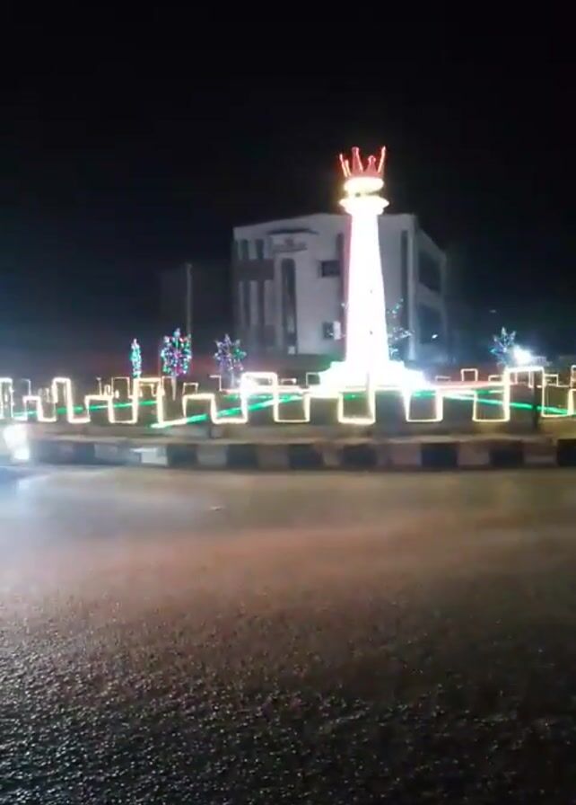 roundabout decorated with lights at night. A white tower with a red crown on top stands in the center of the roundabout. Cars and an auto rickshaw pass by the roundabout. The road is wet. A building is visible in the background.