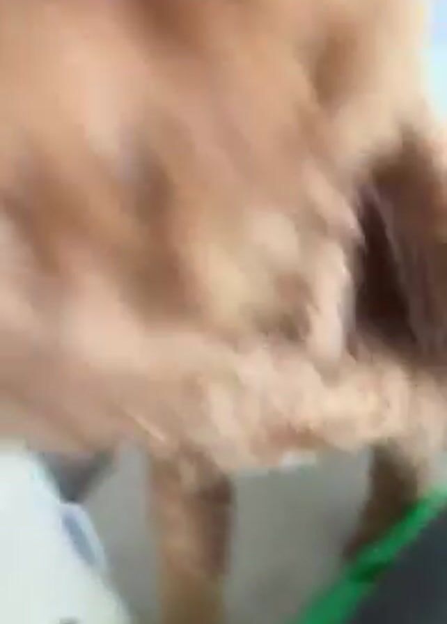 brown poodle dog sitting on a light-colored couch. The dog first moves its head and licks its nose before sitting up straight and looking at the camera. The couch is decorated with pillows and a brown blanket. There is a wooden shelf with various items in the background.