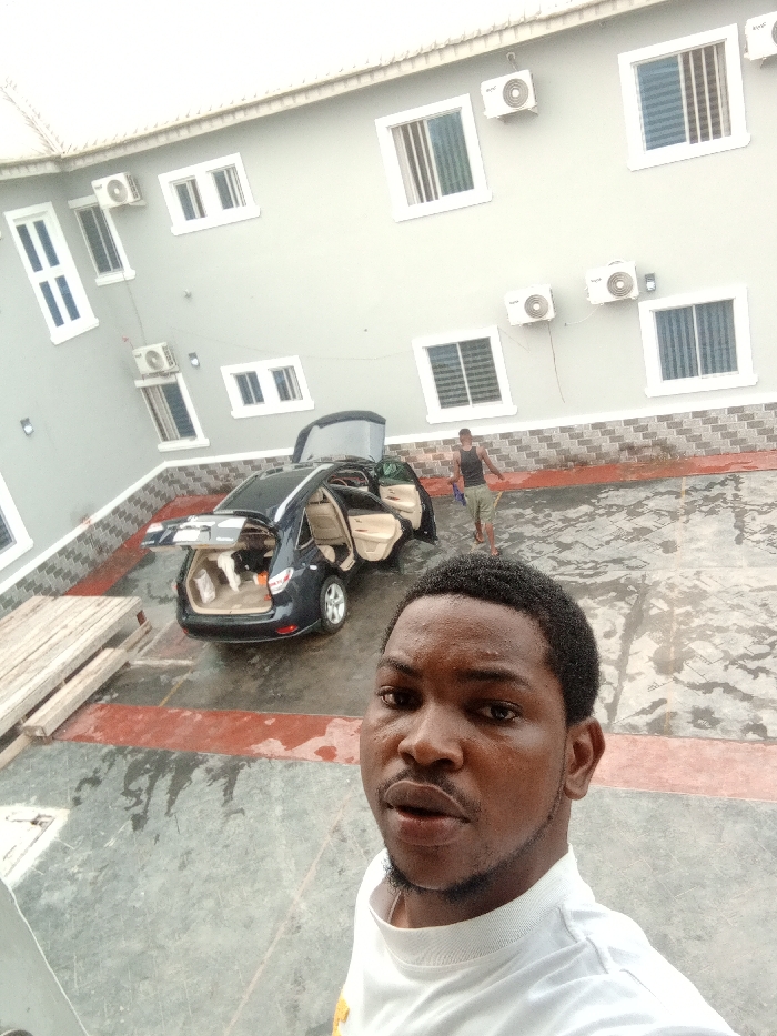A man wearing a white t-shirt takes a selfie outdoors. Behind him, a dark SUV has its rear door and a side door open, revealing a light-colored interior. A man wearing a tank top stands near the vehicle. The photo is taken in a courtyard, with a building featuring numerous windows and air conditioning units in the background. Piles of lumber are visible to the left.