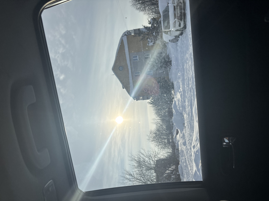 The scene is viewed through a car's sunroof, bright sunlight dominating the shot. A building with snow-covered roof is visible, surrounded by snow-laden trees and a snow-covered ground. A parked car is partially seen covered in snow. The sky is bright with wispy clouds. Car interior details are visible around the sunroof frame.